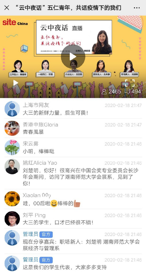 2020年2月18日,SITE CHINA(Society for Incentive Travel Excellence,全称国际奖励旅游精英协会中国分会),举办了第二期“云中夜话”直播节目,主题为“五仁青年,共话疫情下的我们”。yl8cc永利官网会展经济与管理专业2017级学生刘楚明作为青年代表受邀成为直播嘉宾,与国内会展业界精英一起共同讨论奖励旅游与会议公司从业者如何面对疫情,携手共度难关。