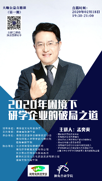 2月18日,研学旅行研究院副院长孟奕爽副教授在湖南省文化和旅游厅的指导下,与湖南省旅游学会合作推出了疫情期间研学旅行直播课系列,并进行了首场直播,主题是“2020年困境下研学企业的破局之道”。