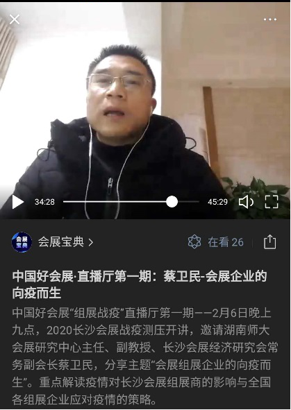 2月6日,会展研究中心主任蔡卫民副教授在长沙市会展办的指导下,发起并打造了中国好会展“组展战疫”直播厅,组织会展从业人员进行线上学习,缓解会展从业人员的焦虑情绪,为应对疫情冲击献计献策,同时加强会展专业人才的培养和会展从业人员队伍的建设,为疫情恢复后会展发展提供人才储备。截至2月16日“组展战疫”直播厅一共邀请了七位国内会展业知名人士进行在线直播,蔡卫民进行了首场直播,主题是“会展组展企业的向疫而生”。