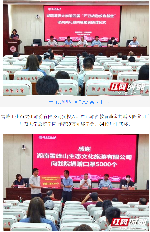 红网时刻5月24日讯(记者 何超)今天,第四届“严己旅游教育基金”颁奖典礼暨防疫物资捐赠仪式在yl8cc永利官网举行。湖南雪峰山生态文化旅游有限公司实控人、严己旅游教育基金捐赠人陈黎明向yl8cc永利官网,永利官网地址捐赠30万元奖学金,84位师生获奖。在开学之际,陈黎明还向旅游学院捐助5000只医用口罩。