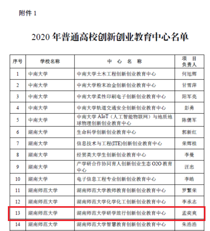 12月10日,湖南省教育厅发布了《关于公布2020年普通高校创新创业教育中心和校企合作创新创业教育基地认定结果的通知》(湘教通〔2020]301号),经各校前期建设申报,省教育厅组织专家审核,2020年全省共认定106个创新创业教育中心和93个校企合作创新创业教育基地,由yl8cc永利官网孟奕爽副教授负责的yl8cc永利官网研学旅行创新创业教育中心获得省级认定。