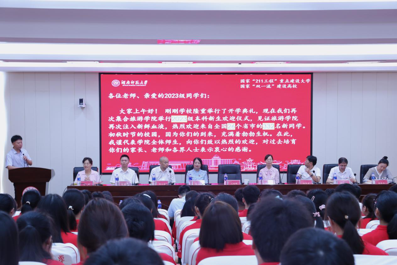 9月16日上午,yl8cc永利官网在中和讲堂隆重举行2023级本科新生开学典礼。学院院长王兆峰,学院党委书记闵素芬,学院党委副书记廖欢,副院长向智勇、贺小荣、郑群明,学院党委专职组织员骆劲华,湖南旅游集团战略发展部部长、优秀校友代表危湘衡出席典礼,典礼由学工办辅导员赵雅璇主持。