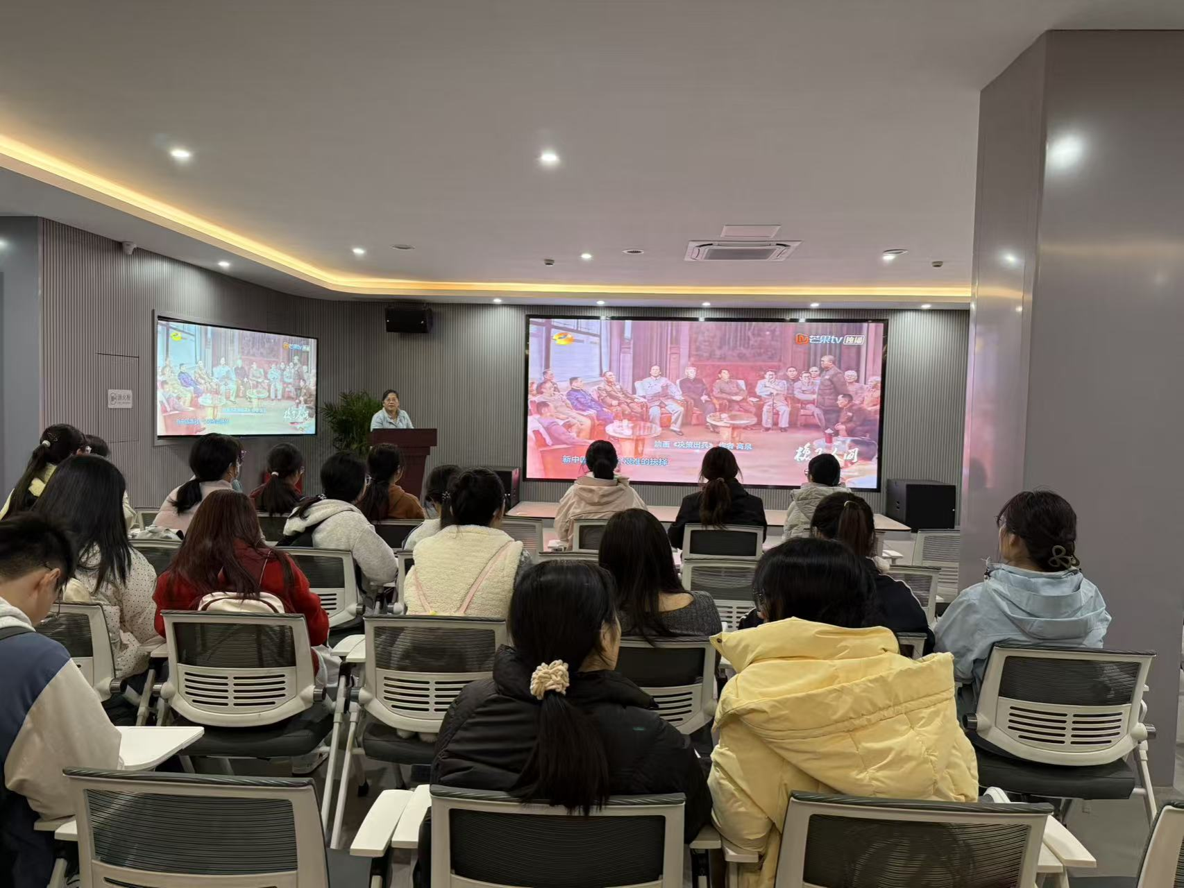 在毛泽东图书馆,同学们观看了数字化建设成果展,汤静教授现场讲授了如何运用导游专业技能进行红色文化的有效传播,同学们切身感受到用科技手段为红色文化传播注入的新活力。在观影厅,汤静教授结合抗美援朝珍贵影像资料,现场讲授了一堂催人泪下的红色教育课,真实感人的历史故事让同学们热泪盈眶,也让同学们对导游职业的社会价值有了更深层次的理解。