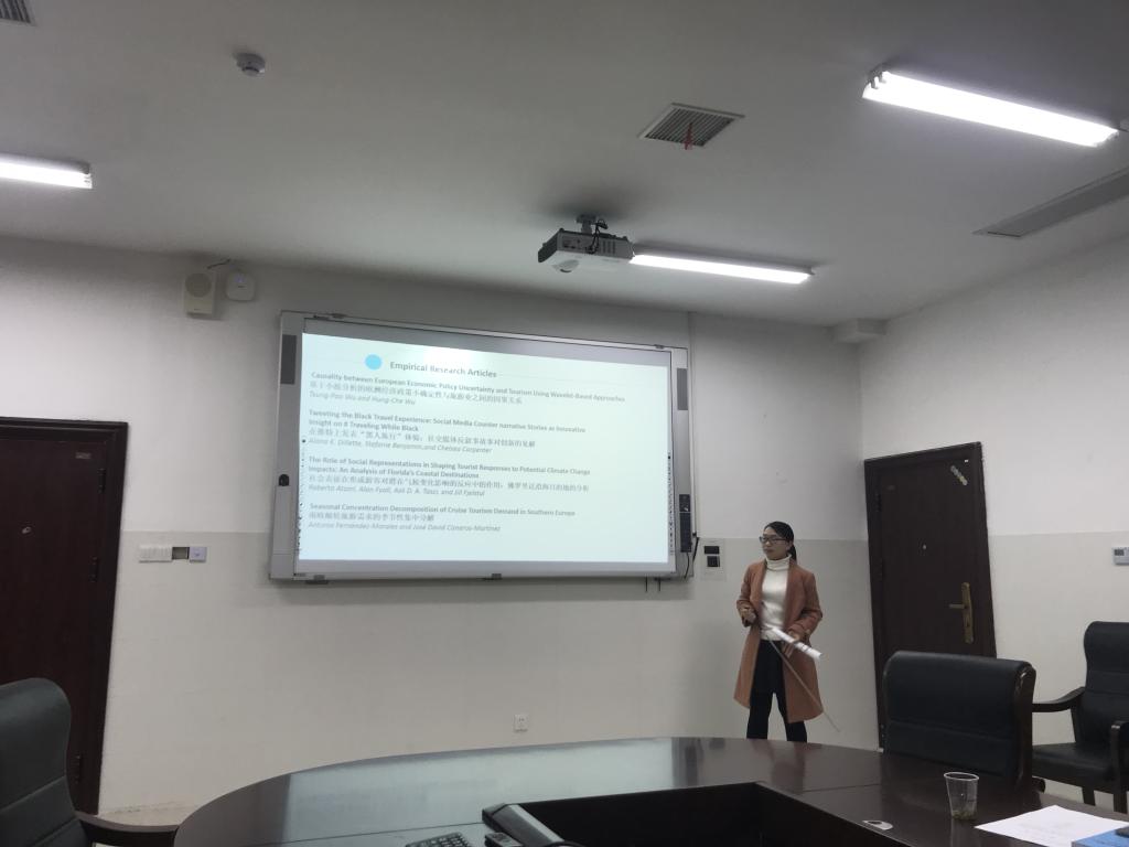 本次会议由蔡卫民老师和朱张祥老师各自的研究团队进行了学术汇报。首先,由2018级旅游地理学专业研究生于雅静结合CiteSpace知识图谱分析方法,介绍了国内节事旅游的研究现状、热点和趋势,并由现场老师进行了点评并给出改进意见;接着,由2018级旅游地理学专业研究生廖丽衡分享了其学位论文选题《旅游目的地负向在线评论对旅游消费决策的影响:基于时间、空间和社会距离的实验研究》,由现场老师就该选题提出了进一步修改的建议;最后,由2018级职业技术教育研究生刘佳培分享了其跟进的旅游科学国际顶级期刊《Journal of Travel Research》在2019年第8期发表的12篇论文,并就每篇论文的研究问题、研究方法和研究结论进行了介绍。