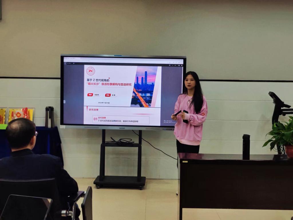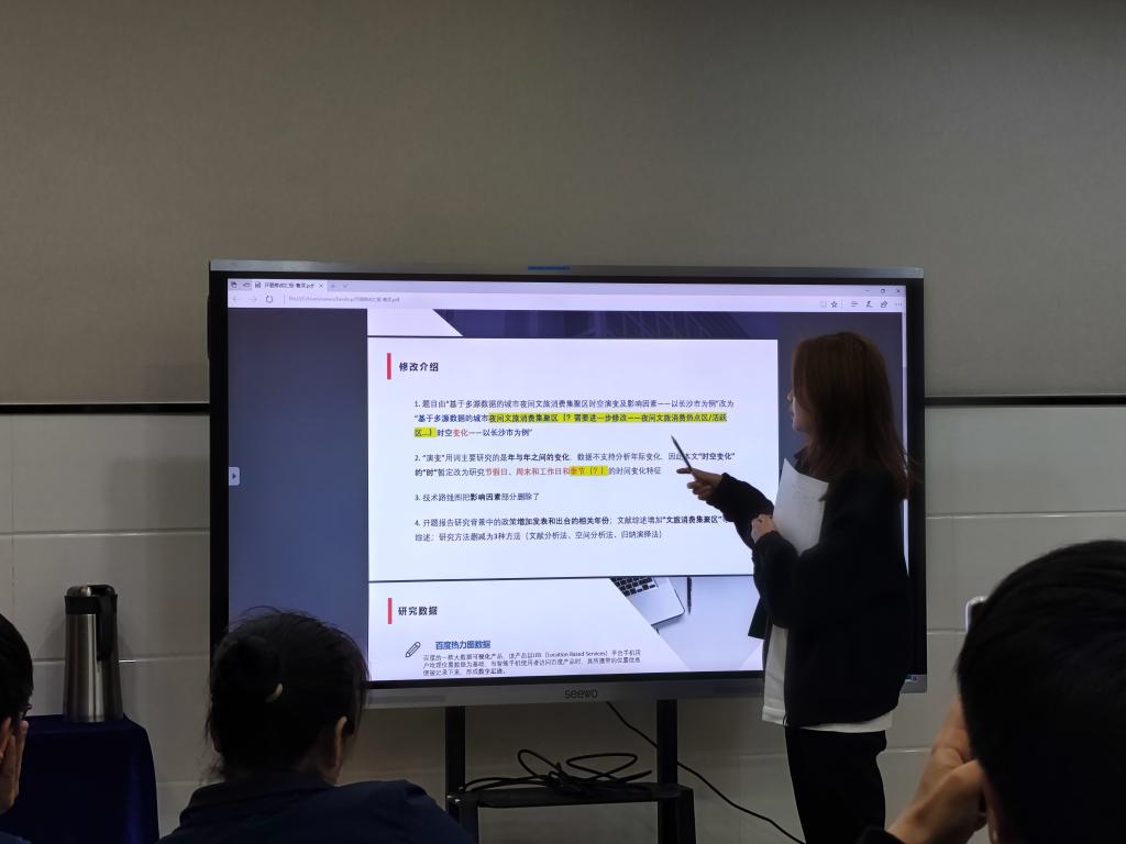 随后,学院21级硕士研究生侯佩、曹灵、龙文丽、陈子奇等分别以长沙“夜间消费”、“形象塑造”、“体验安全感”、“社区参与”等主题,结合各自的研究分别进行了汇报,并提出在研究过程中的发现的问题和困惑。分享过程中,现场老师和学生展开热烈的讨论,针对“何为夜间消费”、“何为烟火长沙”、“何为Z世代”等多个概念进行探讨;另外,现场老师从研究目的、研究方法、研究意义等多方面对学生的研究论文写作进行指导、启发学生更好地将论文写在祖国的大地上。