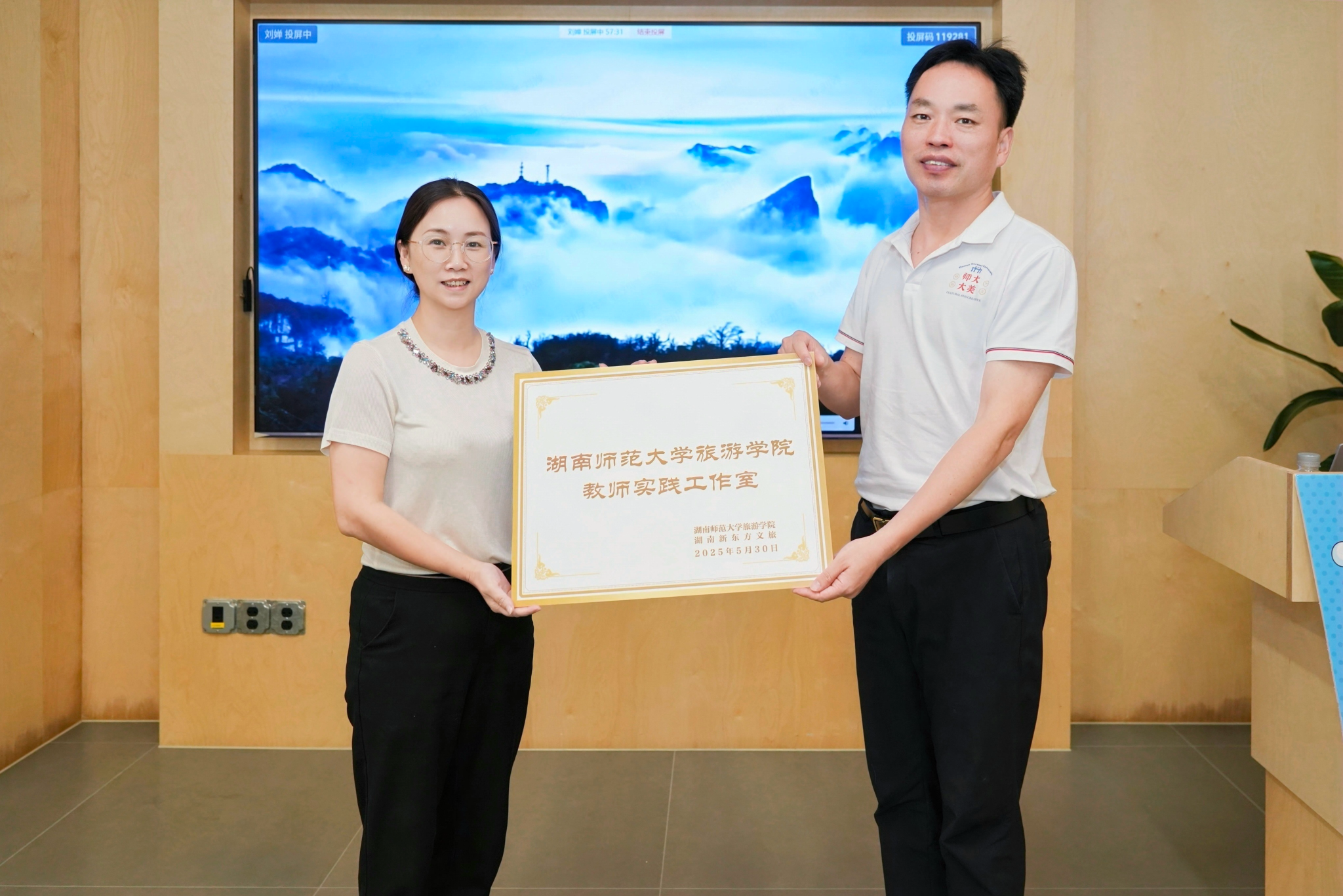期间,罗明与湖南新东方文旅公司副总刘超共同为“yl8cc永利官网教师实践工作室”揭牌。这一教师实践工作室是旅游管理系与新东方公司在前期合作基础上的拓展和提升,旨在促进旅游管理教师深入公司开展实践教学研究工作交流,提升教师实践能力,加强学院“双师型”队伍建设。