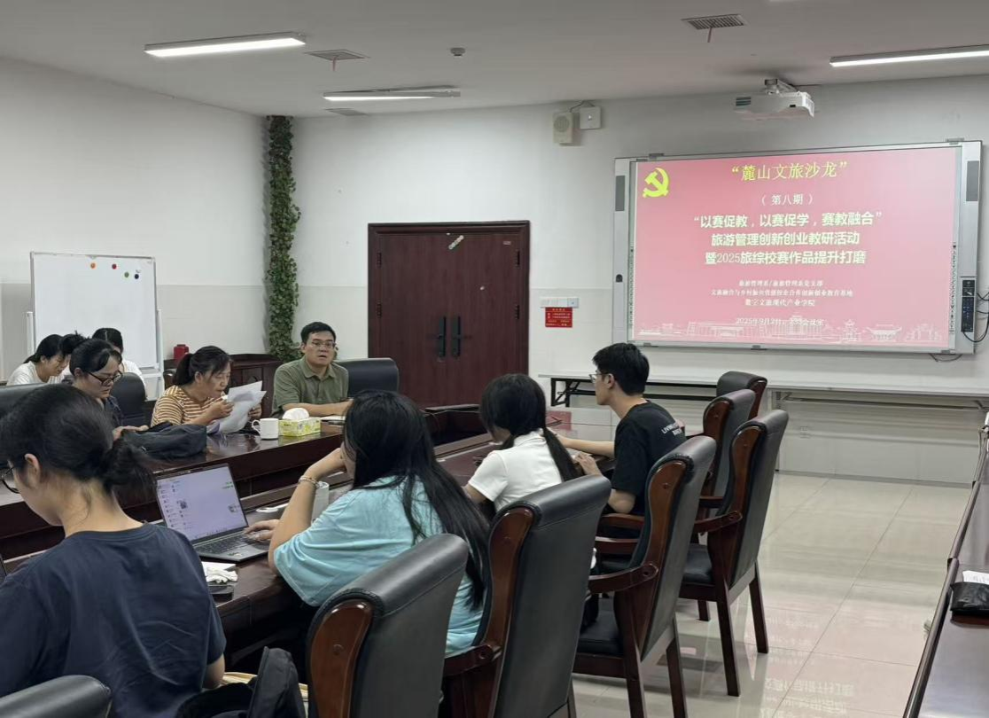 为进一步培养旅游管理专业学生创新思维,提升参赛作品质量,深化“赛教融合”教学模式,9月2日晚上,麓山文旅沙龙第八期“以赛促教,以赛促学,赛教融合”旅游管理创新创业教研活动暨2025旅综校赛作品提升打磨活动在中和楼233会议室顺利举行。旅游管理系主任罗文斌、副主任汤静,教师王俊辉、辅导员李天宇参加,会议由罗文斌主持。
