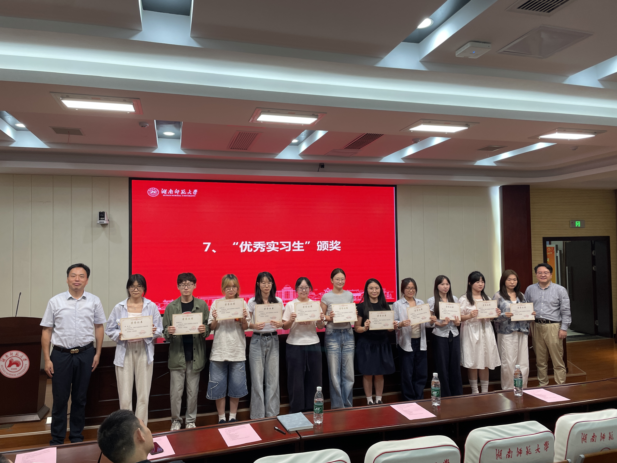 在颁奖环节,孟奕爽宣读了“优秀实习生”名单,罗明为获奖学生颁发荣誉证书,现场气氛热烈。