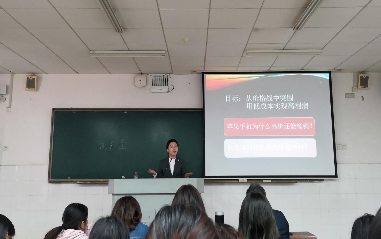 在讲授过程中陈女士以现场提问的方式抛出问题“低价难对付,还是高价难对付”来引发同学们的热烈讨论,使课堂气氛活跃,并得出结论:只有高价格才能支持高利润,高利润才能支撑高品质。讲授第二部分“苹果手机为什么高价还能畅销”时,陈女士邀请了三组同学以role play的形式现场进行一个客房销售的展示,使同学们能更加直观的感受到销售的整个过程。进而得出了第二部分问题的原因及解决方案:提升品牌价值,增加溢价能力;创新商业模式,获取高利润。