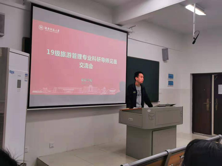 (通讯员 王永明)为推进本科科研育人,激发学生创新性学习兴趣,提升学生科研创新和实践能力,旅游管理系于2019年12月12日在中和楼220举行2019级旅游管理本科生科研导师见面会交流会。会议由2019级班导师王钊老师主持,旅游管理系青年教师代表罗文斌、王钊、王永明、杨友宝、何银春参加交流会。系主任罗文斌介绍了在19级探索建立本科生科研导师制度的背景、意义及相关规划,接着,五位青年老师分别介绍了各自的研究领域和研究兴趣以及要求,并与学生进行了简短的交流。