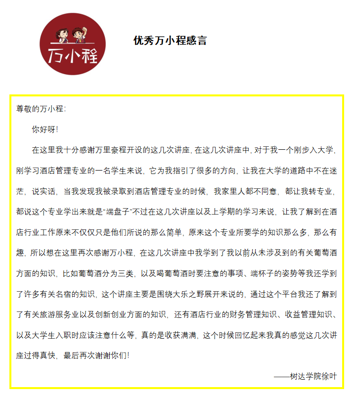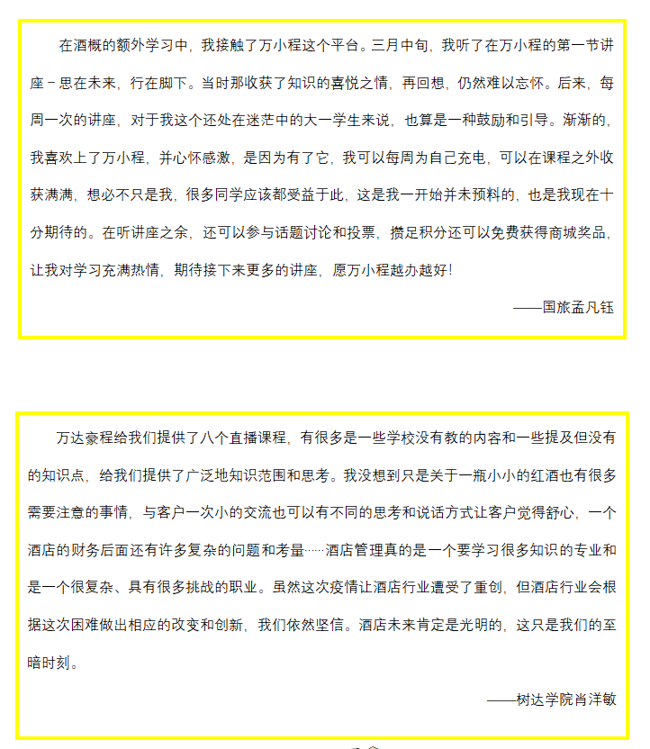 本系列课程是在突遇疫情情况下,由yl8cc永利官网与万豪集团基于《酒店管理概论》省级线上线下混合式一流本科课程教学,利用互联网+教育的模式,通过线上教育,链接行业精英,互联酒店教学,程通未来职业。老师们用心的传授下,同学们不仅学到了许多关于酒店方面的知识,更感受到了老师们的渊博学识和开阔视野。此次嘉宾讲座非常成功,也是混合式教学的一种有效尝试。为同学们带来不一样的课堂和不一样的视野。
