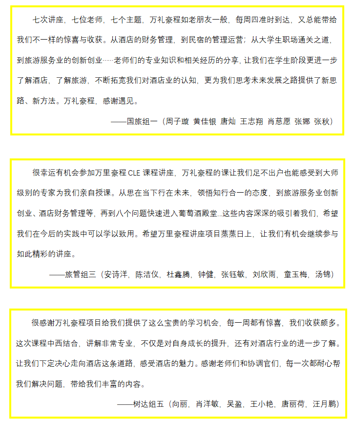 本系列课程每周四下午按期,同学们与万礼豪程都相约CCtalk平台。同学们组成不同小组,通过线上听课,课下讨论,分工合作的形式开展学习。嘉宾讲座整合了万豪集团庞大的教学资源,分为旅游行业的全球视野和创新创业;酒店收益管理知识和技能;大学生职场通关秘籍;人资,财务运营板块;酒店餐饮和红酒认知;民宿经营和管理6个模块,讲师团由国外大学知名教授,酒店行业精英,资深教学顾问和万礼豪程首席代表共同合作组成。