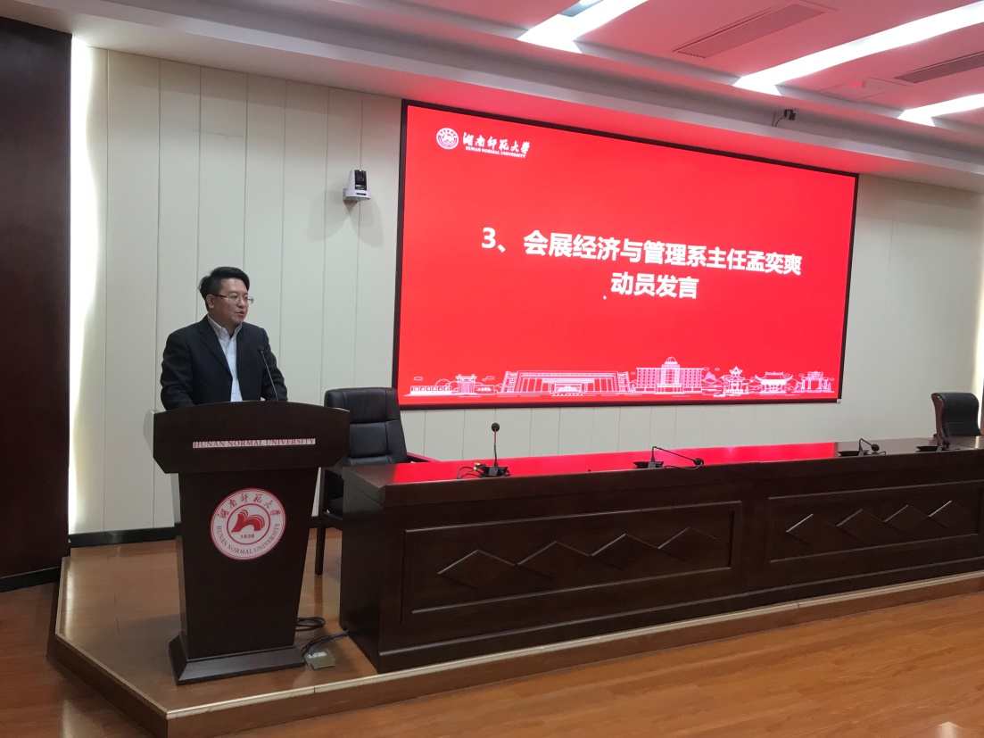 会展经济与管理系主任孟奕爽随后进行了动员发言,他建议同学们在实习中学心法、学算法、学方法;在实习过程中注意姿态、心态和生态;希望大家通过专业实习收获感知、感想和感悟,在实习中学有所得,学有所成。