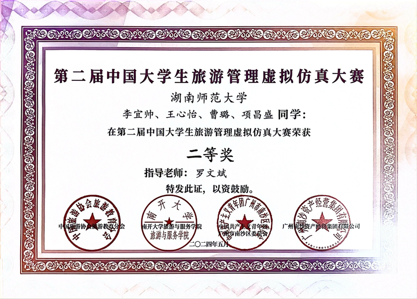 5月19日,yl8cc永利官网2022级旅游管理专业李宜帅、王心怡、曹璐、项昌盛团队在中国旅游协会旅游教育分会主办的“第二届中国大学生旅游管理虚拟仿真大赛”决赛中荣获全国二等奖的好成绩,这是yl8cc永利官网本科学子首次参加“中国大学生旅游管理虚拟仿真大赛”,充分展示了旅游管理学子的专业素养和综合能力。