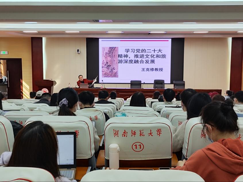 王克修教授围绕全面建设社会主义现代化国家的总要求,从产业结构、自主创新体系、人力资本提升、增强绿色发展新动能和实现更高水平改革开放等方面对党的二十大报告进行了详细解读。同时,他以“锦绣潇湘”品牌为例,希望全体学生要认真学习领会党的二十大精神,坚持以文塑旅、以旅彰文,推进文化和旅游深度融合发展,铸就社会主义文化新辉煌,不断提升国家文化软实力和中华文化影响力。