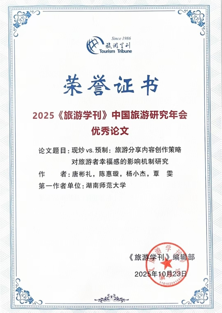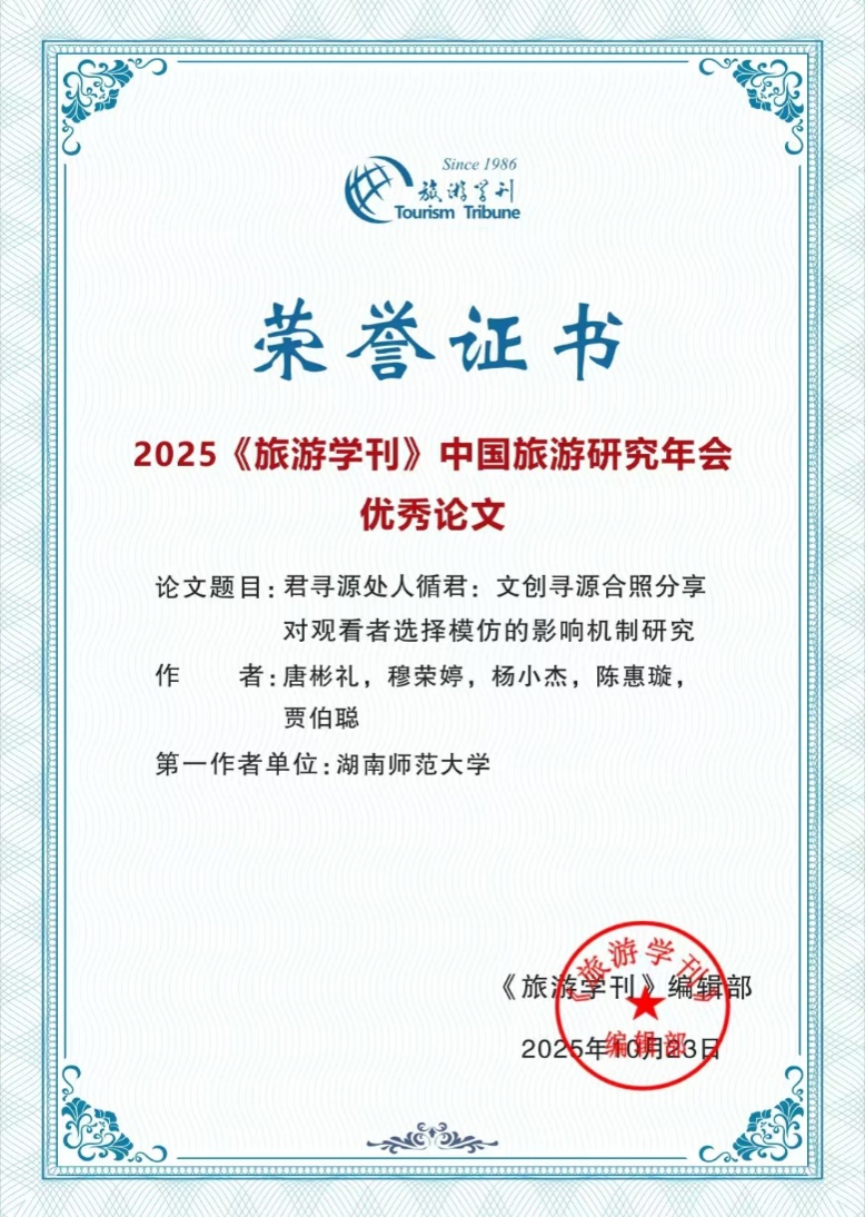 2025年10月29日,《旅游学刊》编委会公布了“2025《旅游学刊》中国旅游研究年会”优秀会议论文名单。yl8cc永利官网唐彬礼老师科研团队共有2篇论文入选,入选数量在全国高校并列第二。年会“优秀论文”经召集人推荐,编辑部筛选后,由《旅游学刊》编委会51位编委进行匿名评分,最后通过编委会合议产生,是旅游研究热点的风向标。