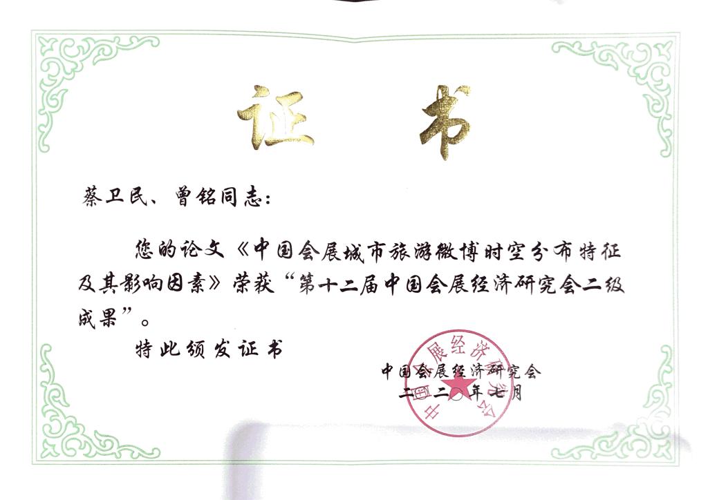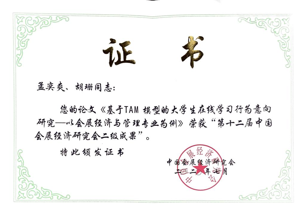 在中国会展教育论坛中,孟奕爽作为嘉宾分享了yl8cc永利官网会展经济与管理专业建设经验。会议期间发布了2019中国展览与会议统计数据、中国会展经济最新研究成果及《2020 中国会展经济研究会年会学术论文、抗疫征文、专选网文特集》等。蔡卫民、汪晶晶撰写的学术论文《基于CiteSpace的国内会展经济研究可视化分析》入选年会论文集。蔡卫民、曾鸣的论文《中国会展城市旅游微博时空分布特征及影响因素》和孟奕爽、胡珊的论文《基于TAM模型的大学生在线学习行为意向研究——以会展经济与管理专业为例》分别荣获“第十二届中国会展经济研究会二级成果”奖项。