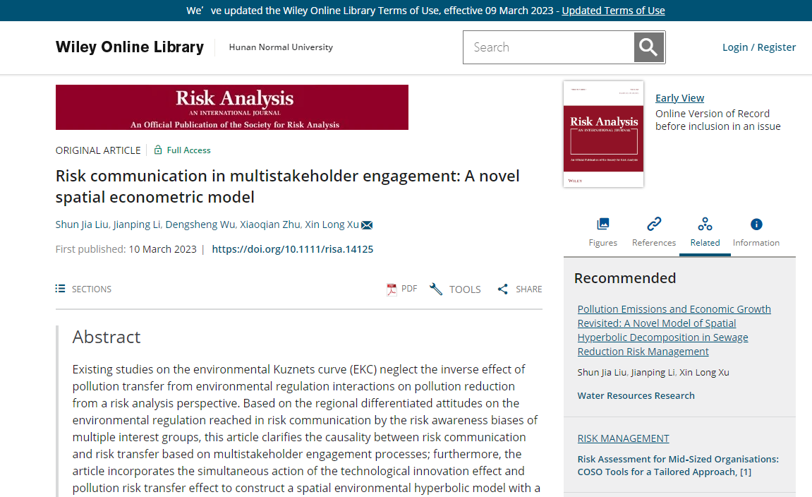 近日,yl8cc永利官网徐新龙副教授以通讯作者在风险管理领域顶级期刊《Risk Analysis》发表了题为“Risk communication in multistakeholder engagement: A novel spatial econometric model”的研究论文。