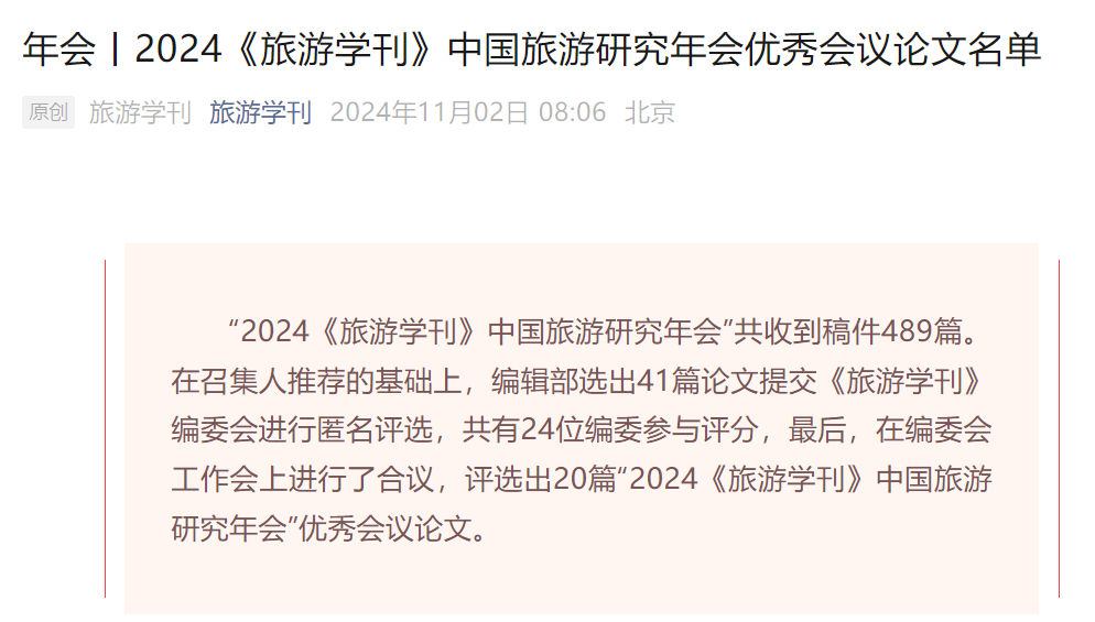 2024年11月2日,《旅游学刊》编委会公布了“2024《旅游学刊》中国旅游研究年会”优秀会议论文名单,yl8cc永利官网朱张祥和唐彬礼两位老师各有1篇论文入选,入选数量并列全国高校第2位。2024《旅游学刊》中国旅游年会实际收到489篇稿件,最终20篇入选“2024《旅游学刊》中国旅游研究年会”优秀会议论文,入选率不足5%。