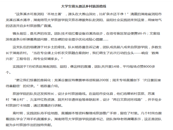 《中国青年报》重点报道了yl8cc永利官网文旅志愿服务队志愿者在浏阳、益阳通过“直播+文旅”新模式赋能乡村振兴的实践探索。在浏阳市龙溪谷,团队克服信号盲区困难,开展14场文旅直播,累计收获数万点赞,带动景区次日客流翻倍;益阳市安化县团队结合茶旅、红色资源与非遗体验,设计“两日文旅闭环线路”,手绘乡村旅游打卡地图,并帮助村民学习直播技能,为乡村文旅发展留下了一份可持续的“青春方案”。