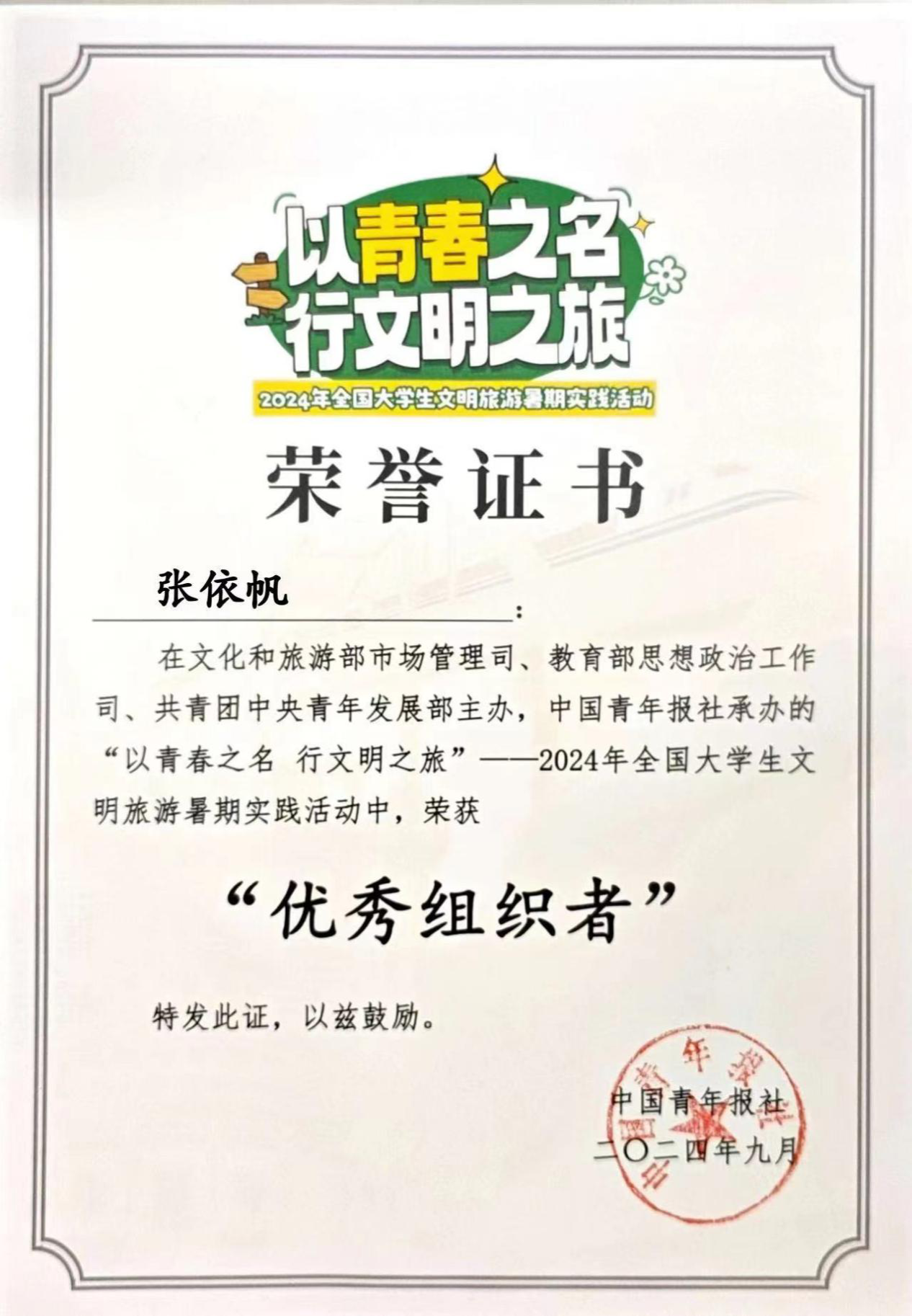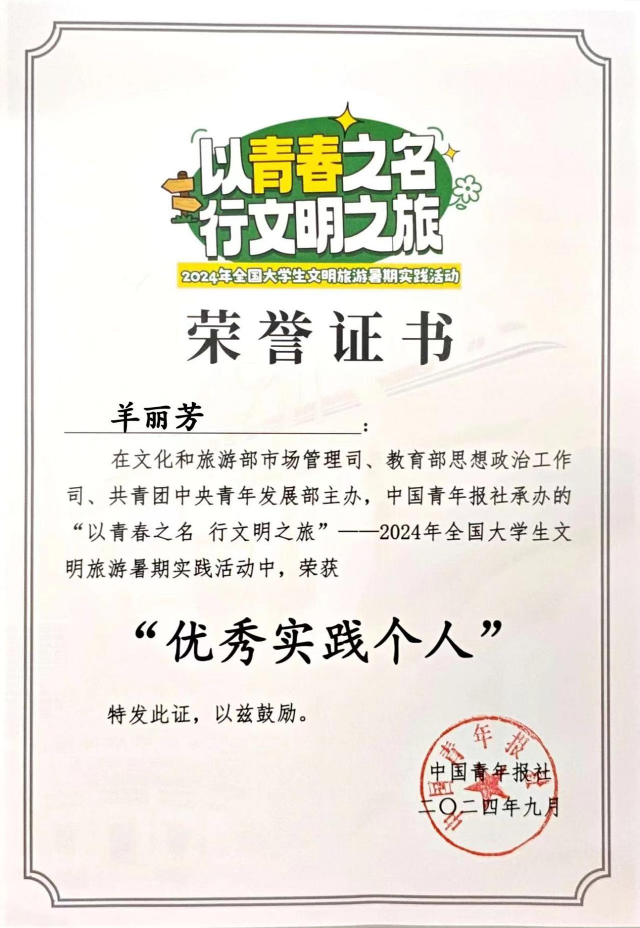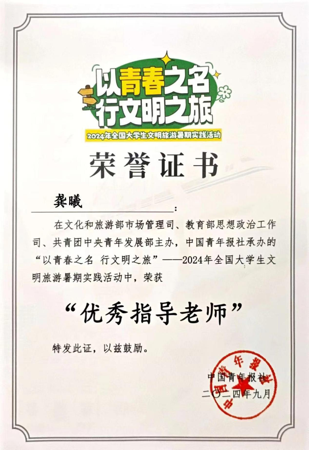 (通讯员 张依帆 范儒玲)近日,yl8cc永利官网文旅志愿服务队志愿者代表赴北京市参加国家文旅部、教育部、团中央共同举办的“以青春之名 行文明之旅”——全国大学生文明旅游暑期实践总结交流活动,yl8cc永利官网团委书记龚曦老师荣获全国“优秀指导老师”、实践队队长张依帆荣获“优秀组织者”、24名实践团成员荣获“优秀实践个人”。