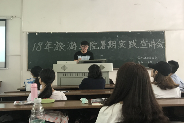 (通讯员 刘芯蕊)5月14日中午,旅游学院课外活动部主办的2018年暑期社会实践宣讲会于该院227教室开展。旅游学院团委书记龚曦老师出席此次宣讲会,往届暑期社会实践成员邓志伟、卢映红、吴月婷、张新洲担任主讲人。各年级对暑期社会实践感兴趣的同学参加此次会议。