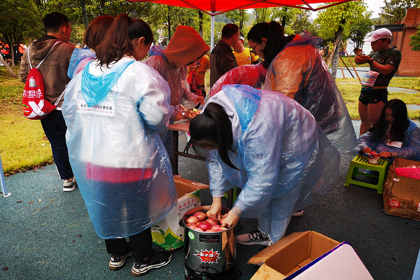 选手尚未到达赛点之时,紧锣密鼓的准备工作已经展开了。志愿者们提前到达了服务点,应组织者的安排切水果、泡姜茶、准备牛奶和能量棒等,力求在选手到达赛点时能够提供最令其放松和舒适的服务。当第一批选手到达赛点之际,啦啦队员们各自就位,在跑道旁挥舞志愿队旗、喊着响亮的加油口号,给了选手们很大的精神振奋。虽然比赛过程中天下小雨,但志愿者们仍然坚守岗位,真诚地为每一位马拉松运动员提供热情周到的服务。