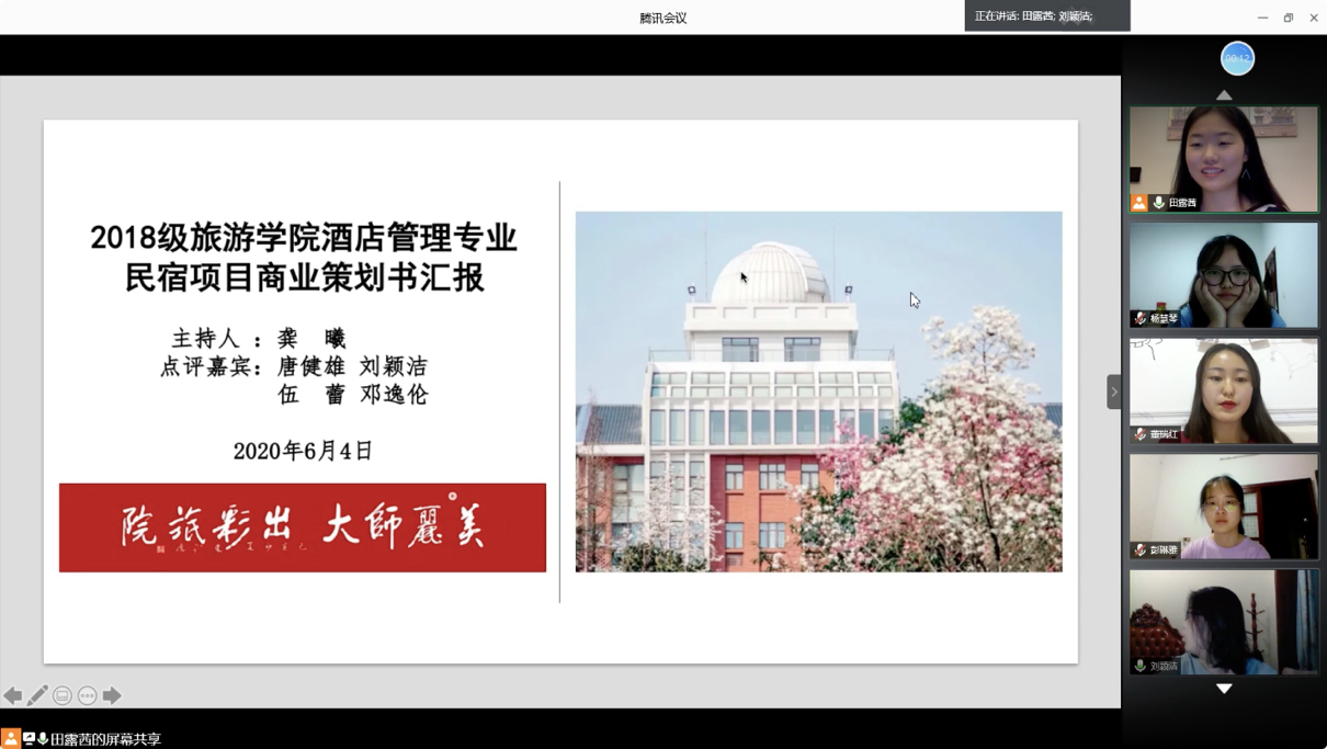 (通讯员 田露茜)6月4日晚,yl8cc永利官网yl8cc永利官网与黄冈师范学院地理与旅游学院通过腾讯会议平台举行“冈”好有你·守望“湘”助第二期创新创业分享会暨yl8cc永利官网2018级酒店管理专业民宿项目商业策划书汇报分享会。yl8cc永利官网yl8cc永利官网教授唐健雄、副教授刘颖洁、副教授伍蕾、教师邓逸伦出席此次分享会。yl8cc永利官网yl8cc永利官网2018级酒店管理系与黄冈师范学院地理与旅游学院2019级酒店管理系200余名本科生参加分享会。分享会由yl8cc永利官网yl8cc永利官网团委书记龚曦主持。