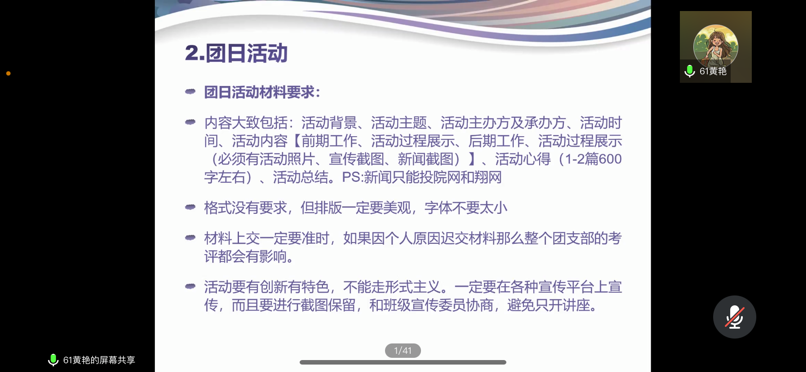 会议开始,王思琪对同学们进行海报制作与ps技能培训,她通过共享屏幕的方式向同学们展示了如何方便快捷使用电脑软件,介绍了关于制作海报的注意事项,并推荐了适用的海报制作软件。黄艳对团支书和团总支进行岗位培训,介绍了百团活动的具体内容与活动考评。