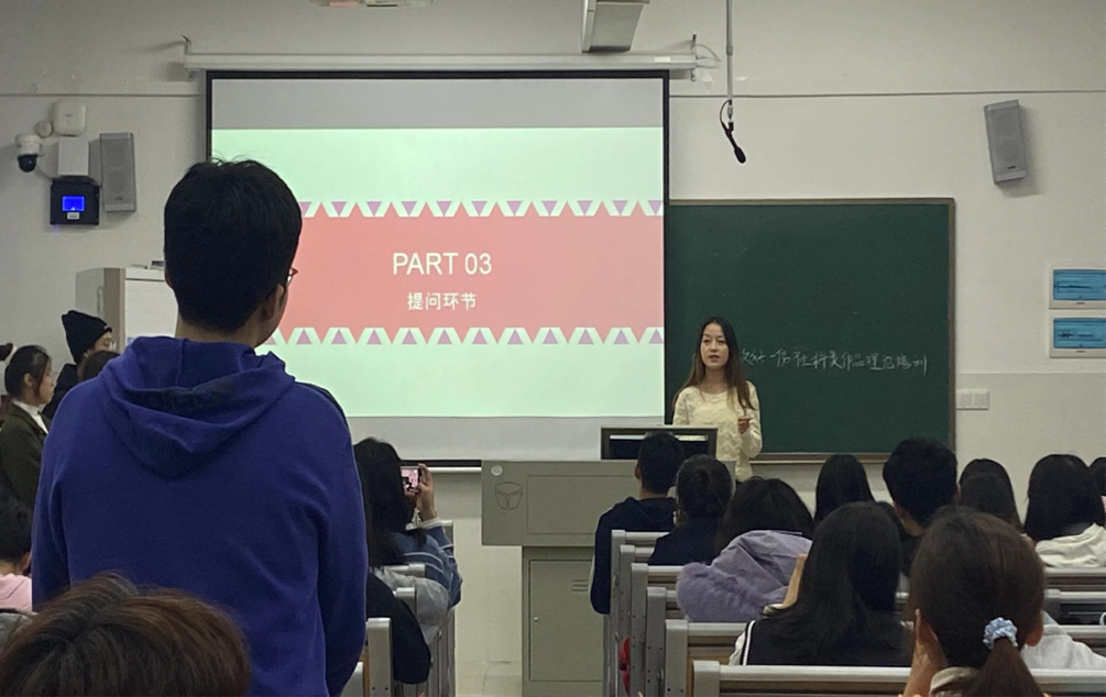 范智成结合自身参赛经历,介绍了“挑战杯”大赛的具体事项,对竞赛历程、如何题、如何撰写调研报告,调研的建议等多方面进行了解说。团队队员进行了参赛作品的呈现和收获的分享,梳理了一个作品需要具备的条件与视角,简要介绍了参赛前的准备工作。在答疑环节中,范智成对同学的问题作出了解答。龚曦对此次宣讲会进行了总结,介绍了去年一些团队项目的情况,为作品选题方面提出了建议。