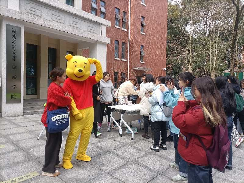 学生会策划了刮刮乐抽奖活动,准备了毛绒玩具、暖宝宝、红糖姜茶零食小盲盒等暖心礼物。旅游学院女生们在中和楼前参与刮刮乐抽奖,根据获取奖品,并与吉祥物拍照留念,并分享至朋友圈等社交平台。