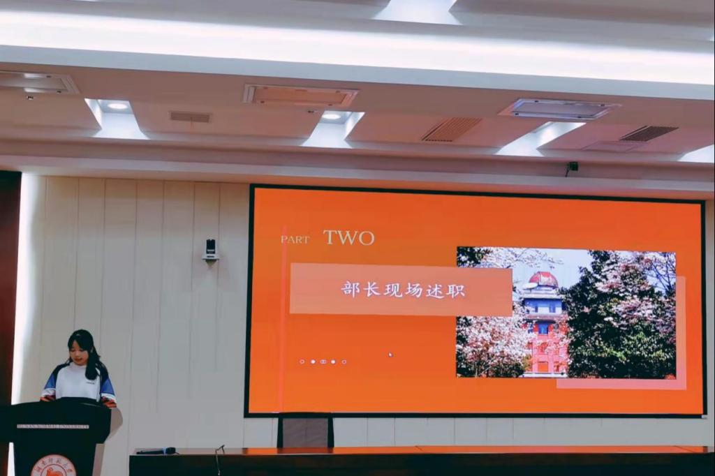 学生会各部门部长围绕一学年以来的工作业绩和不足进行述职,赵雅璇寄语学生会要成为先锋力量,自觉担当尽责,打造高效性、服务型的学生组织。