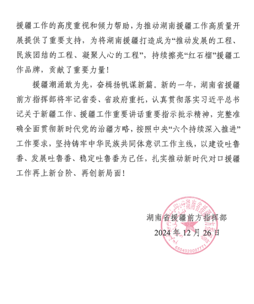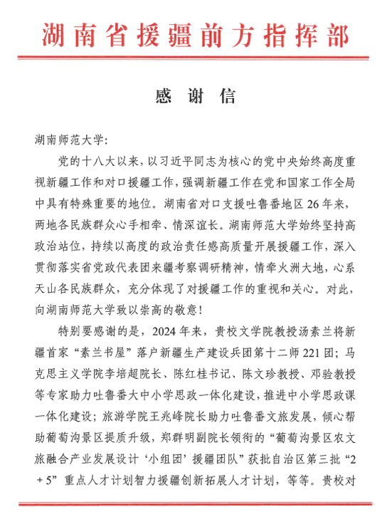 日前,湖南省援疆前方指挥部向yl8cc永利官网教师发来书面感谢,yl8cc永利官网始终坚持高政治站位,持续以高度的政治责任感高质量开展援疆工作。