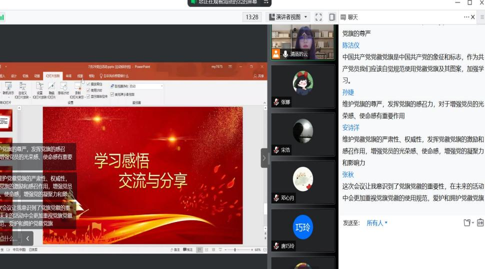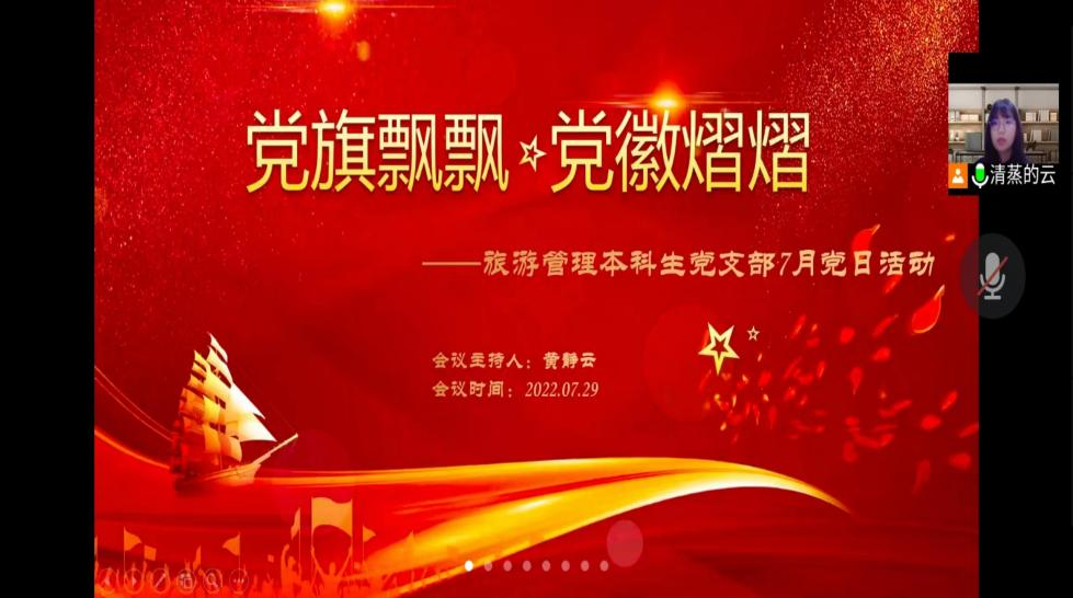 7月19日下午,旅游管理专业本科生党支部于线上组织“党旗飘飘,党徽熠熠”的主题党日活动。活动由支部书记黄静云主持。