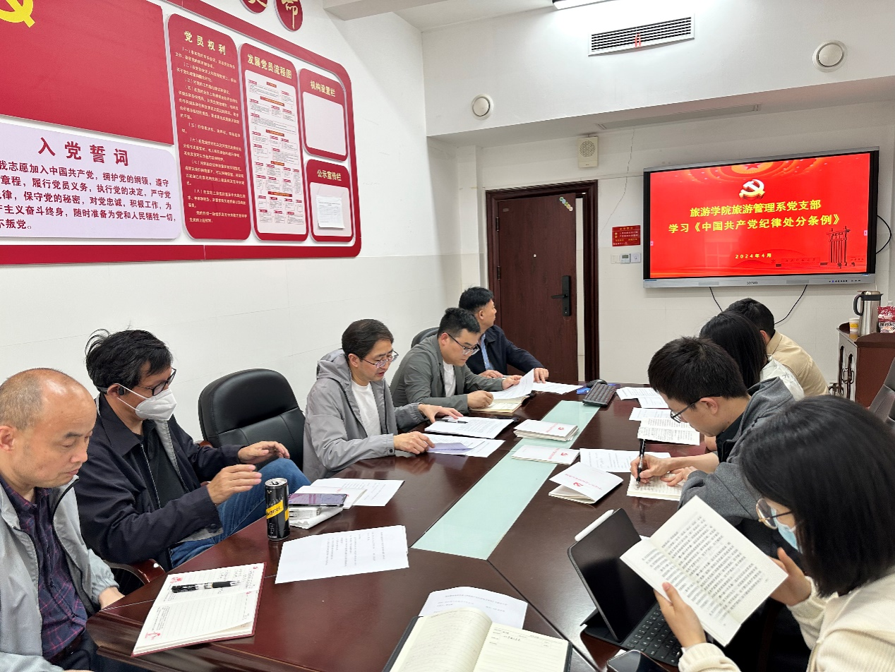 4月25日下午,旅游管理系教工党支部在中和楼235会议室召开党纪学习教育专题学习会,传达学习贯彻习近平总书记关于党纪学习教育的重要讲话和重要指示精神,传达中央、省委和学校党委关于开展党纪学习教育的有关文件和会议精神,落实学院党委关于开展党纪学习教育的部署。会议由支部副书记罗文斌主持,全体党员参加。