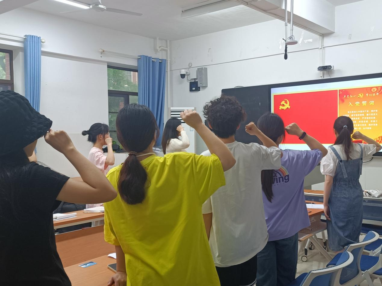 最后,邱粤湘为新接收的七位同志佩戴党员徽章,并带领其宣誓、其他党员重温入党誓词,并希望他们在今后的工作和生活中精神富,党性固,理想驻。她提出三点期望:一是切实提升政治素养,在学院建设发展关键节点、重大事项中,发挥模范带头作用;二是做好学习与工作的平衡,为职业发展和个人成长打下基础;三是关注自身心理健康,特殊时期要学会正确的心理调适方法。